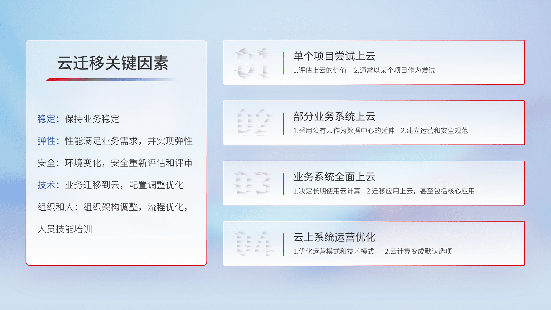 结合实际业务,,,,从规划设计、、、、云平台选型、、、、云原生改造、、、、数据迁移、、、、集成交付,,,迁移全过程为客户识别最佳上云路径,,,,做好风险识别管理,,,,设计网络架构、、、、身份权限、、安全审计合规、、、操作审计、、、、日志审计、、监控告警策略、、、多站点容灾设计等,,,对云上基础设施进行整体规划,,,提升IT治理水平,,,,以满足弹性、、、、高可用、、、、高性能的需求。。。。