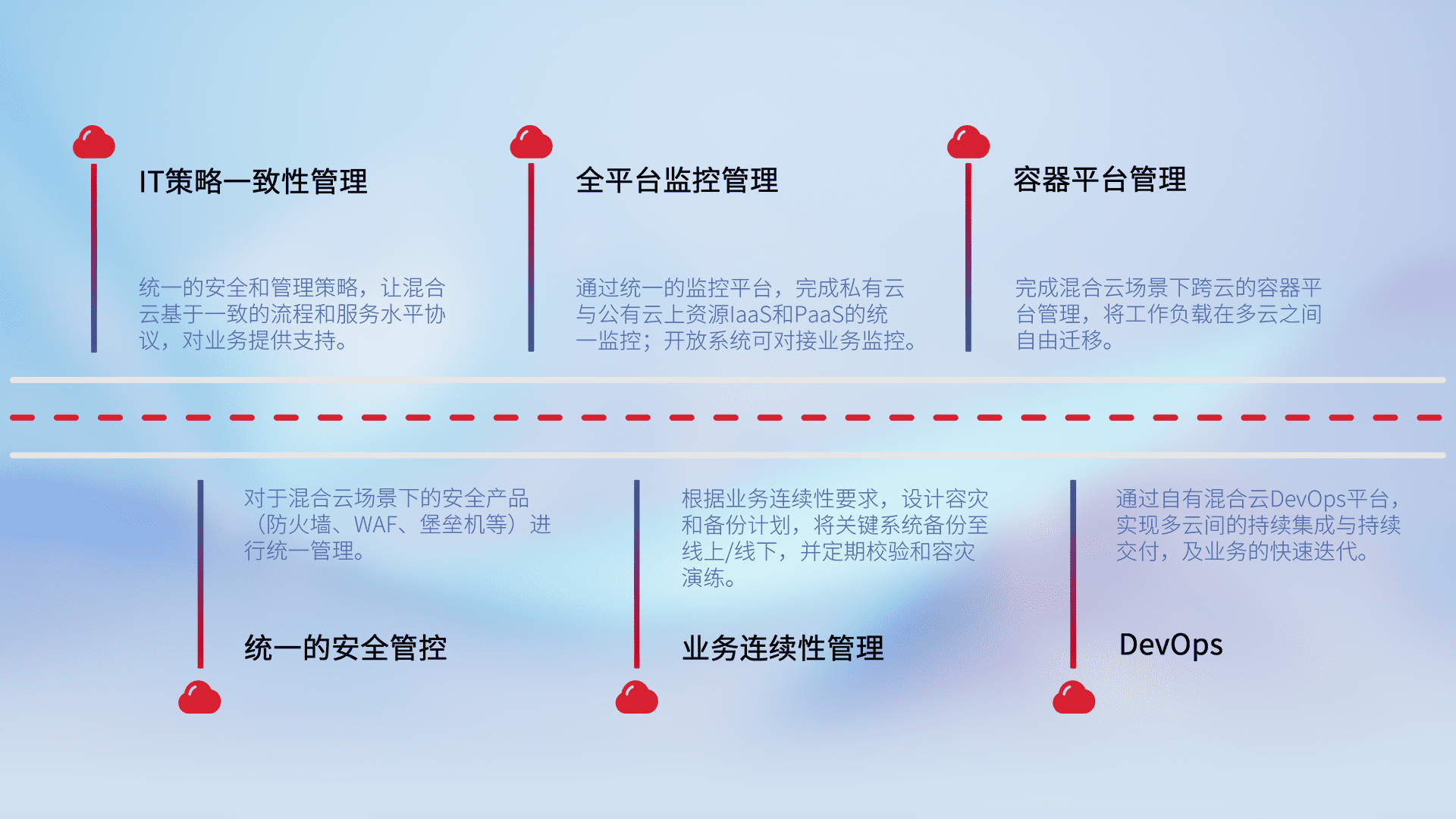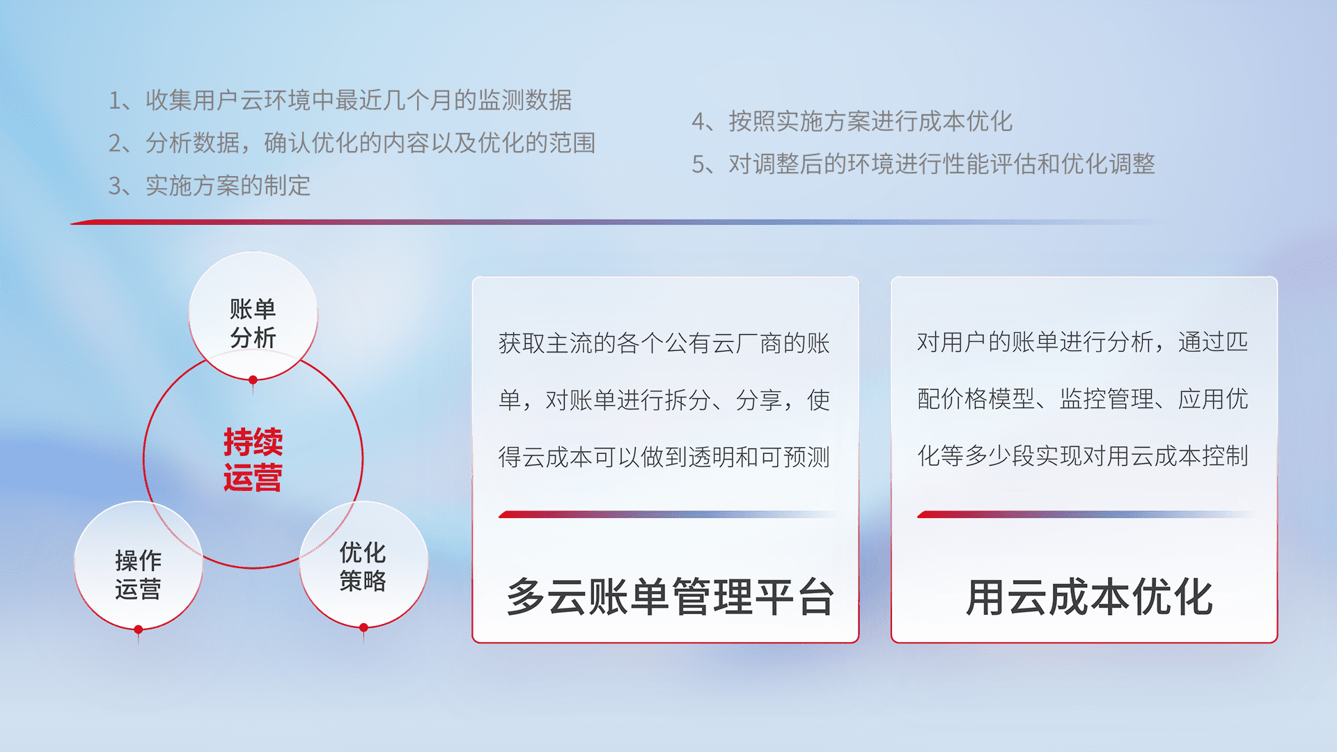通过多云纳管,,以统一的资源数据模型把客户的云资源进行抽象和封装,,,,进而实现对多云资源的统一操作,,,,保障云资源管理的可靠性、、、稳定性与可用性。。。量身定制化运维内容,,配置、、、开发运维、、、补丁管理、、备份、、、监控、、、认证和访问管理、、、审计和日常巡检等,,保障在用云过程中的可靠度,,稳定度以及高可用率。。。