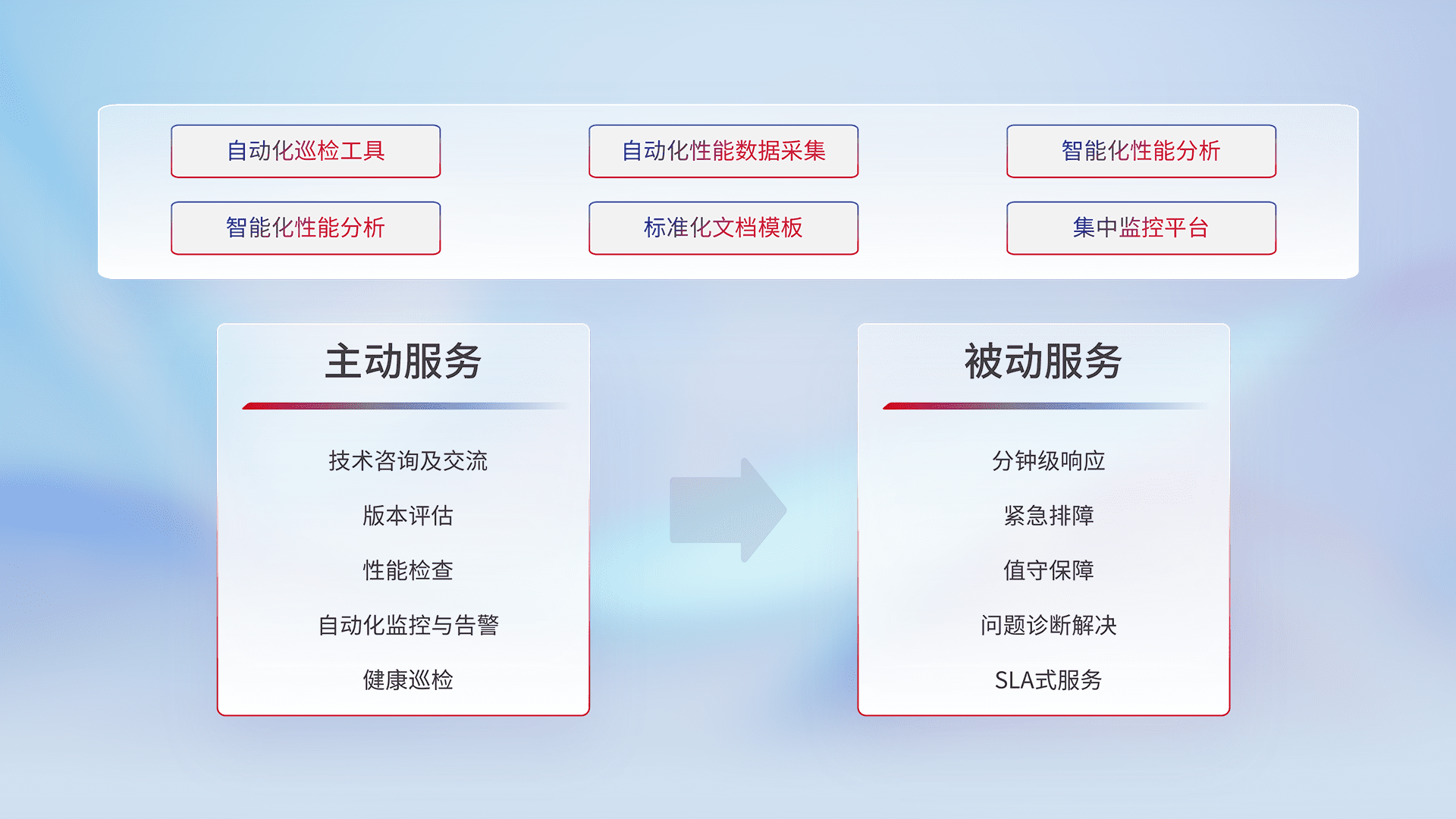 智能化工具和标准化文档,,保障服务质量,,,提供主动服务(包含技术咨询、、、版本评估、、性能检查、、、、自动化监控与告警、、健康巡检)和被动服务包含(分钟级响应、、紧急排障、、、值守保障、、、问题诊断解决、、SLA服务)。。。。